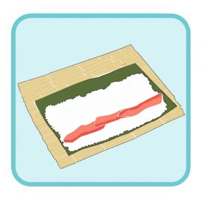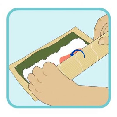 4. Utilizzando la stuoia di bambù arrotola l'alga, il riso ed il salmone fino a chiudere completamente il rotolo.