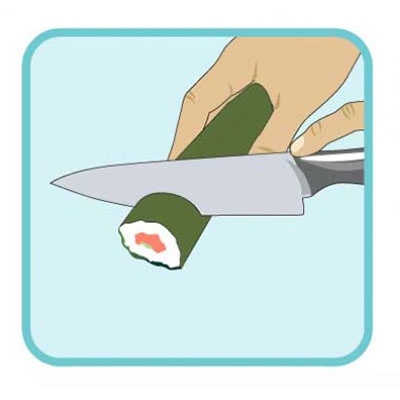 5. Utilizzando un coltello molto affilato e pulito da residui di riso o pesce, immergi la punta in una ciotola d'acqua e fai scorrere una goccia sulla lama. Questo consentirà alla lama di scivolare meglio nel riso "appiccicoso". Taglia il rotolo in due parti uguali, poi avvicina le due parti e pratica altri due tagli alla stessa distanza per ricavare 6 sushi della stessa misura