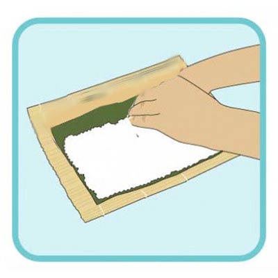 2. Disponi l'alga orizzontale sulla tua stuoia. Inumidisci le mani utilizzando una miscela di acqua e aceto di riso che avrai sistemato in una ciotola sul tuo piano di lavoro. Seleziona una quantità di riso grande come una palla da tennis e inizia ad aprirla sul lato ruvido della tua alga nori. Assicurati che il riso venga distribuito uniformemente sull'alga senza pressarlo troppo. Lascia scoperto il bordo superiore di circa 1 cm dell'alga nori.